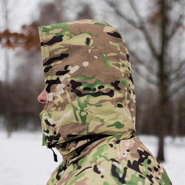 Бушлат-куртка забарвлення Мультикам. Куртка - пряма і подовжена, центральна застібка на блискавку та липучки, комір-стійка, рукави - на резинці. Зручний капюшон, що знімається, можливість регулювання капюшона затяжками.