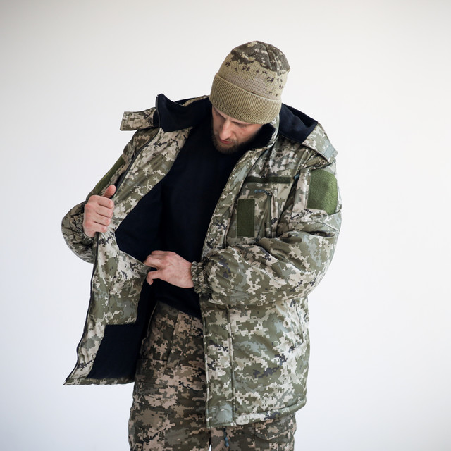 Бушлат-куртка забарвлення піксель. Куртка — пряма та подовжена, застібка центральна на блискавку та липучки, комір-стійка, рукави — на гумці. Зручний знімний капюшон, можливість регулювання капюшона затяжками.